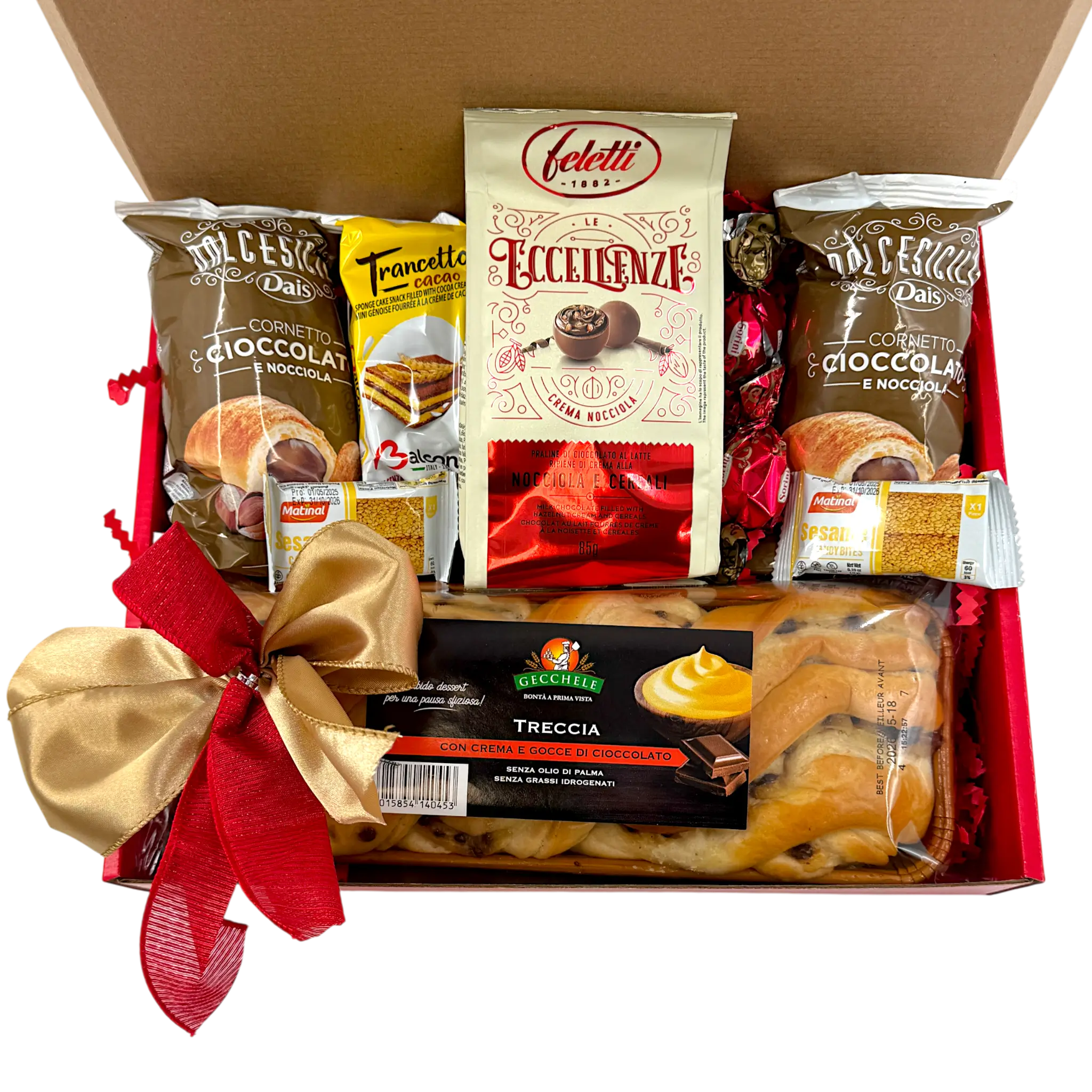 Savour the golden, flaky layers of traditional treccia cake filled with smooth custard cream, bite into freshly baked croissants bursting with hazelnut chocolate cream, and discover the velvety richness of handcrafted milk chocolate truffles. The delicate sesame candy bites add a delightful crunch to this symphony of textures.