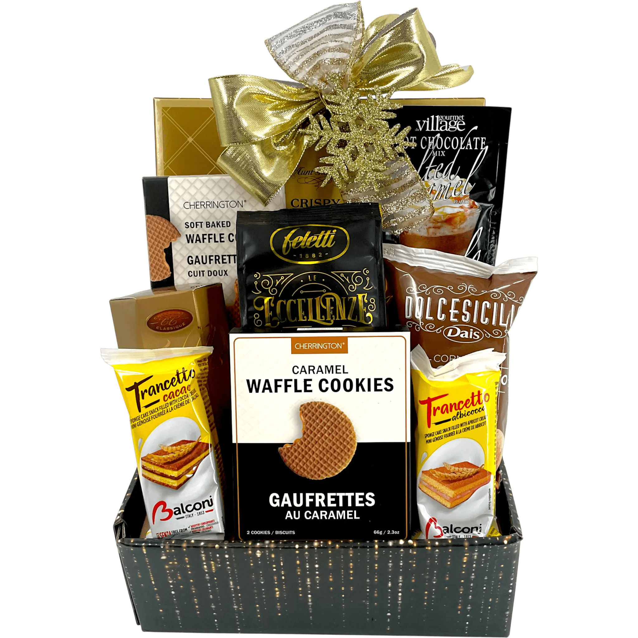 Two mini Italian cakes, one filled with bright apricot cream and the other with smooth cocoa cream, bring traditional European charm. White salted caramel hot chocolate adds cozy warmth, while rich French truffles and silky hazelnut chocolate from Feletti introduce refined sweetness.