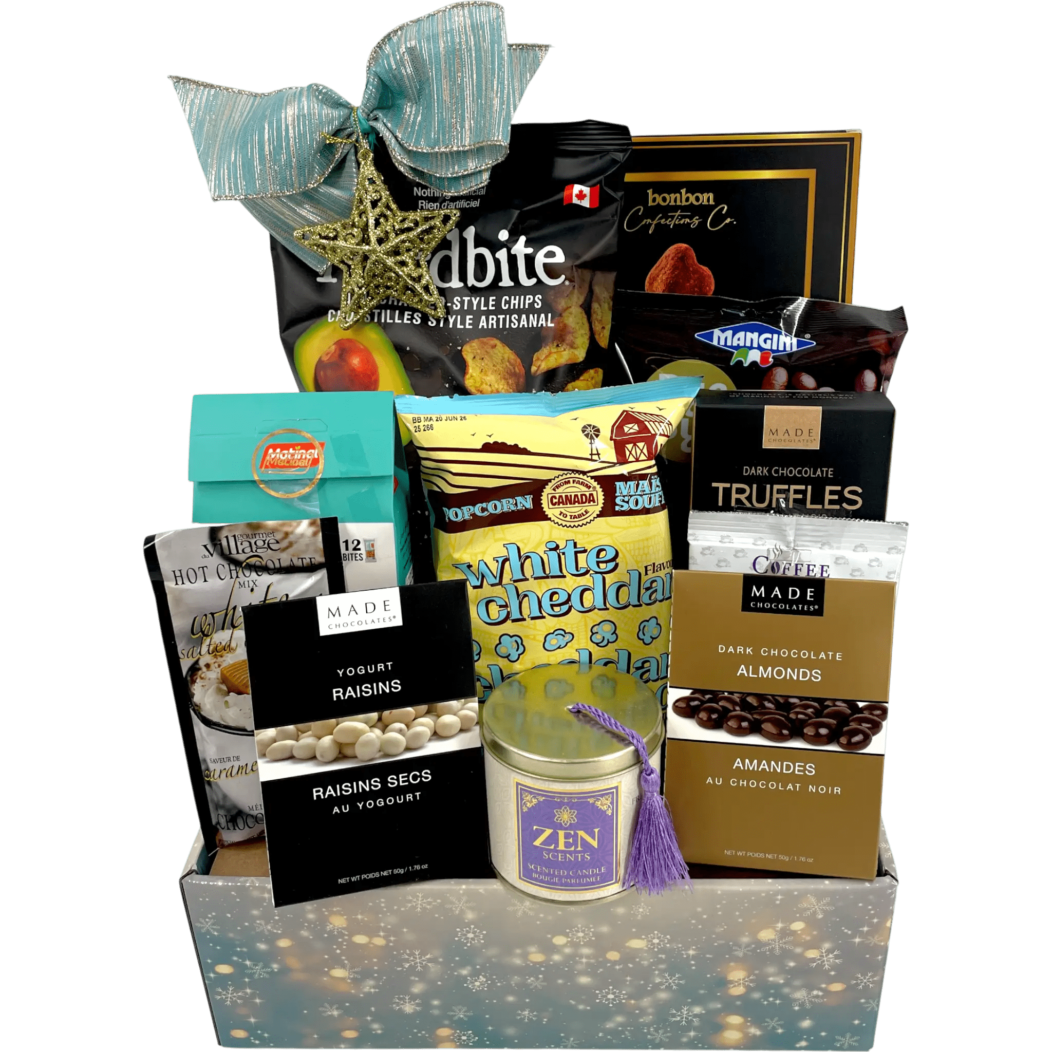 Coffee lovers will enjoy the smooth Breakfast Blend, while Italian coffee creme candies offer a sweet international twist. A zen themed candle adds a warm finishing touch that elevates quiet moments during the season. Presented in a Winter Magic basket inspired by snowy landscapes, this gift delivers style, flavour, and heartfelt intention.