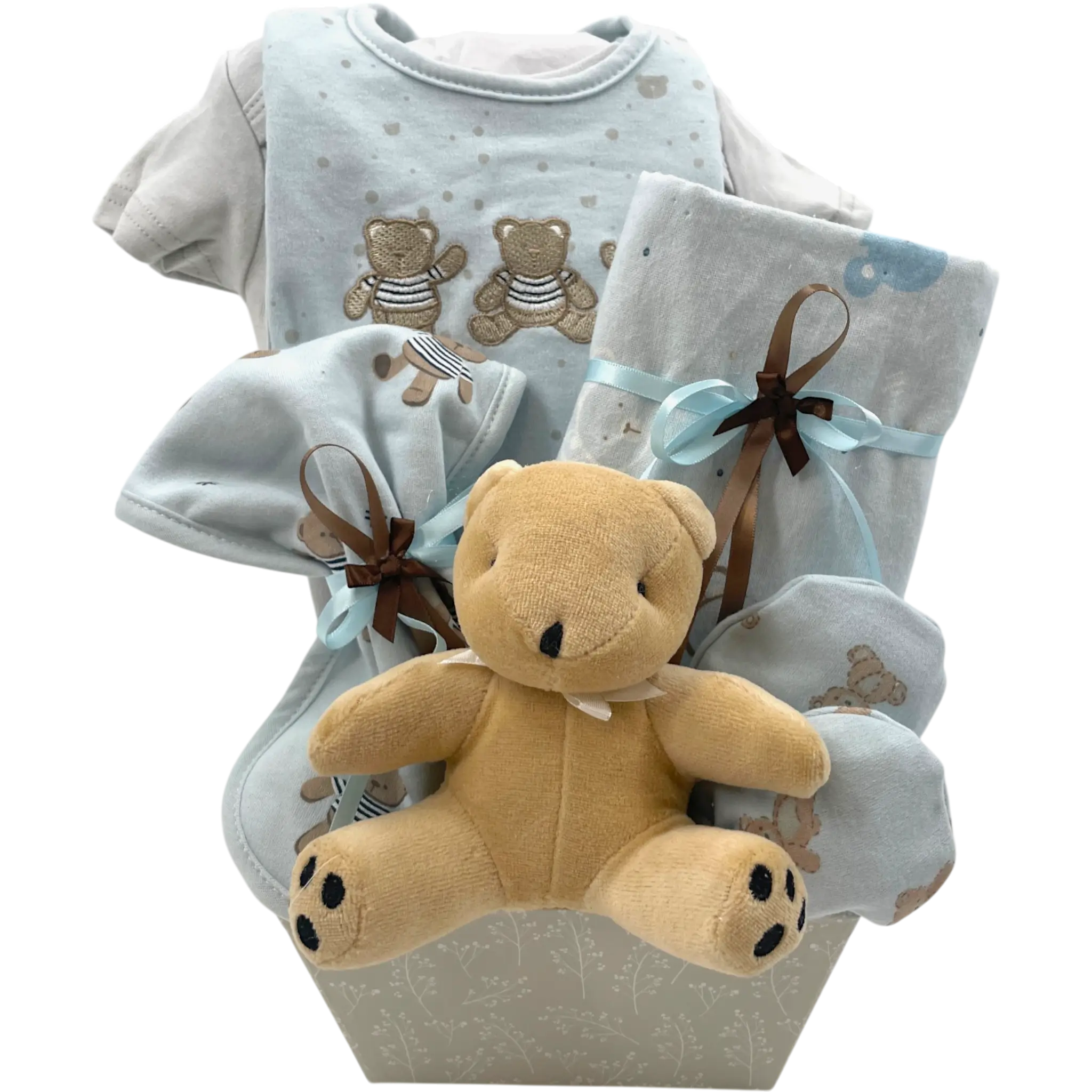 Algunos regalos se olvidan por la mañana. Este se guarda durante años. El Mi Primer Set de Peluche de Oso de Peluche es una cesta de regalo para bebé niño bellamente curada que envuelve todos los elementos esenciales del recién nacido en un irresistible tema de oso de peluche.