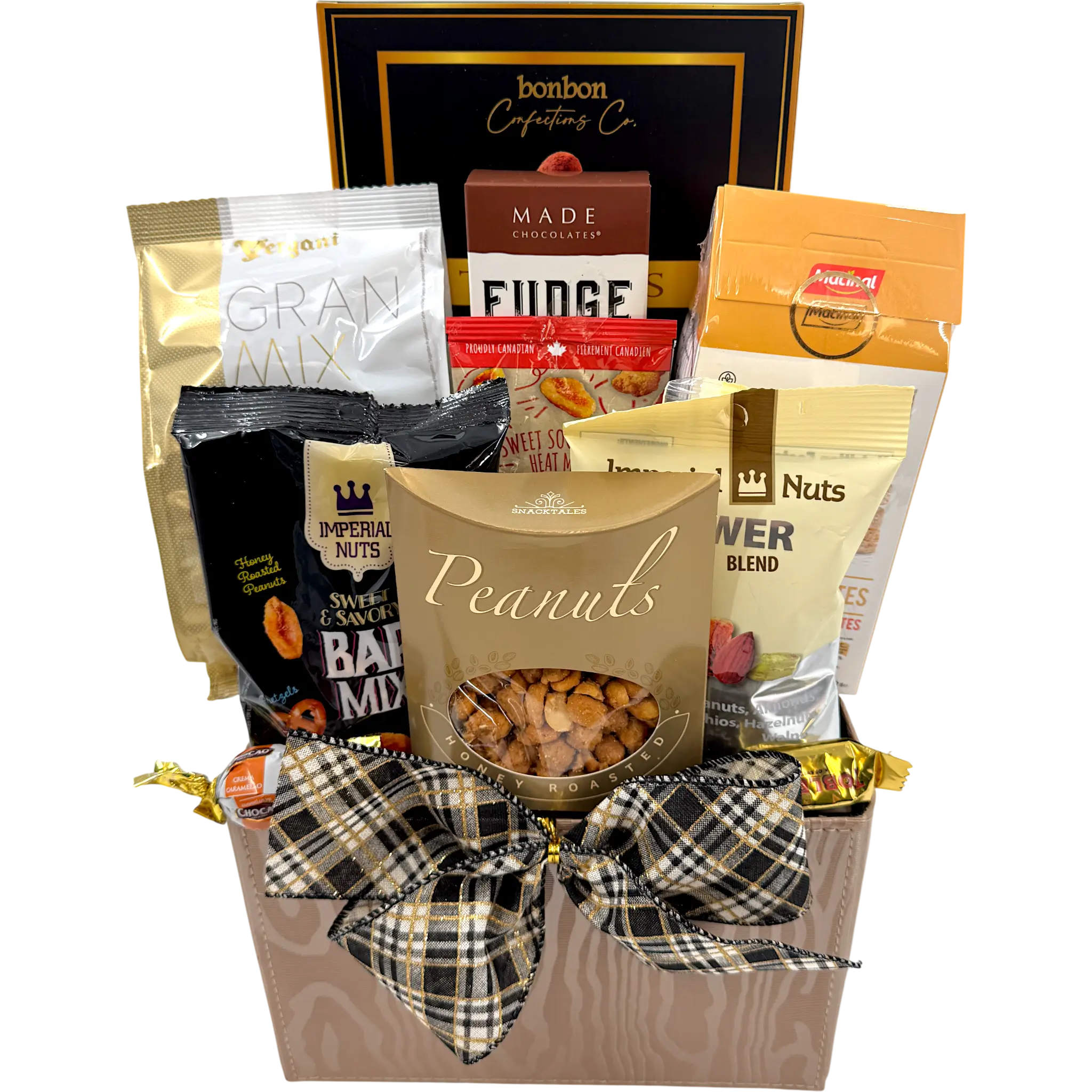 Mélange impérial de noix et de bonbonsUn mélange parfait de cacahuètes, de pépites de chocolat, de raisins secs, de noix de cajou et d'amandes.