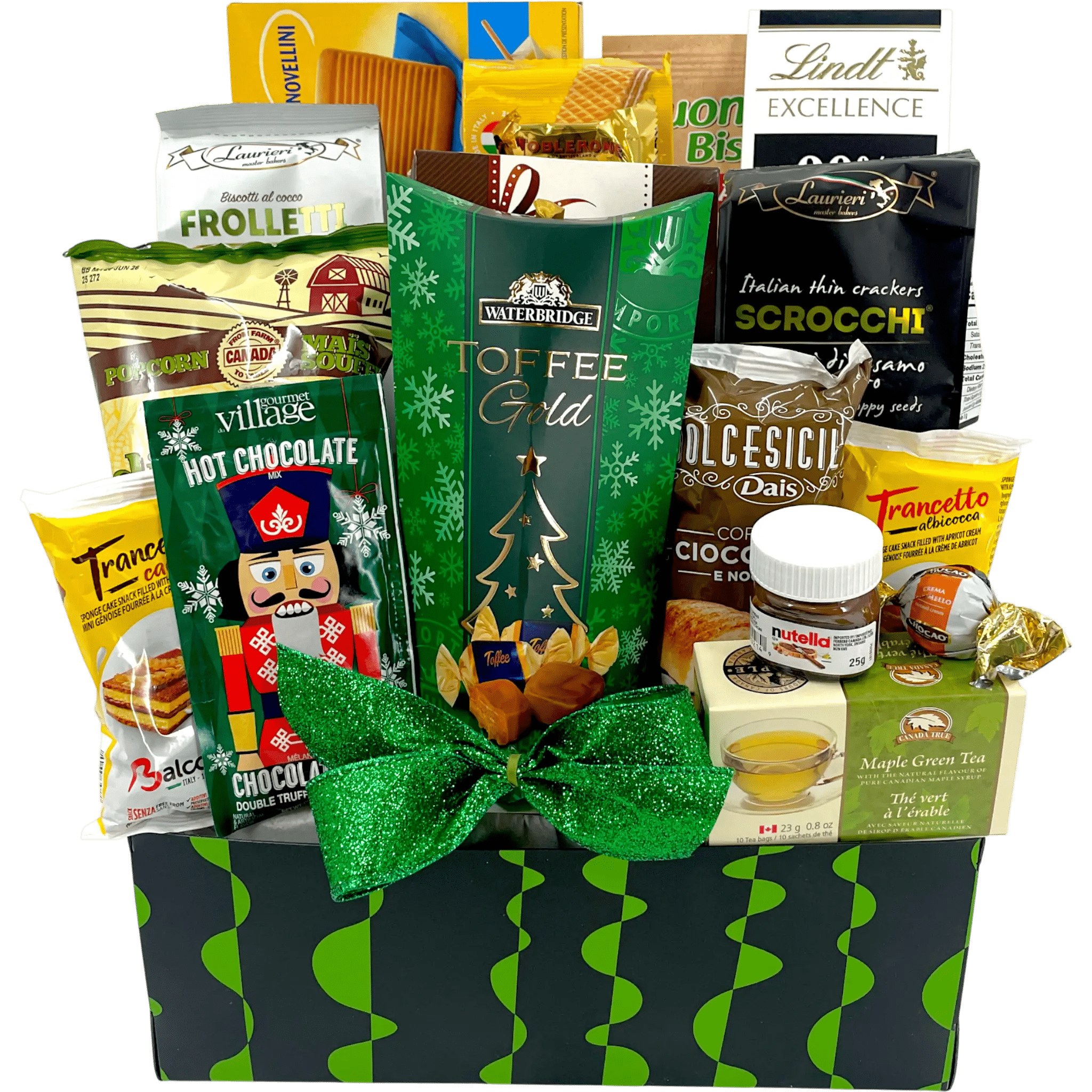 Des sablés au beurre importés d'Italie au caramel fondant et onctueux Waterbridge Toffee Gold, ce panier est un véritable concentré de gourmandise. Savourez l'équilibre parfait entre le chocolat noir Lindt Excellence et les confiseries belges saupoudrées de truffe, ou associez un thé vert canadien à l'érable aux arômes envoûtants à de délicats mini-gâteaux italiens fourrés à la crème de cacao et d'abricot. Chaque bouchée est une invitation à la douceur, à la gratitude et à l'art culinaire.